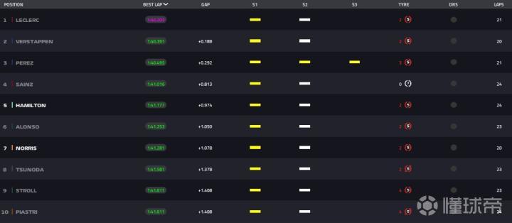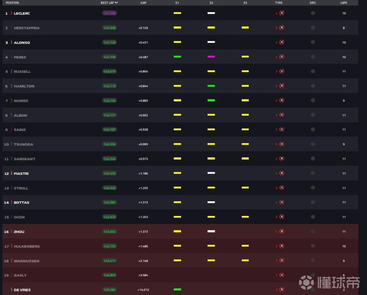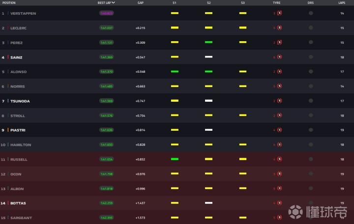 在第一个飞行圈结束后,维斯塔潘、勒克莱尔、阿隆索排在前三。