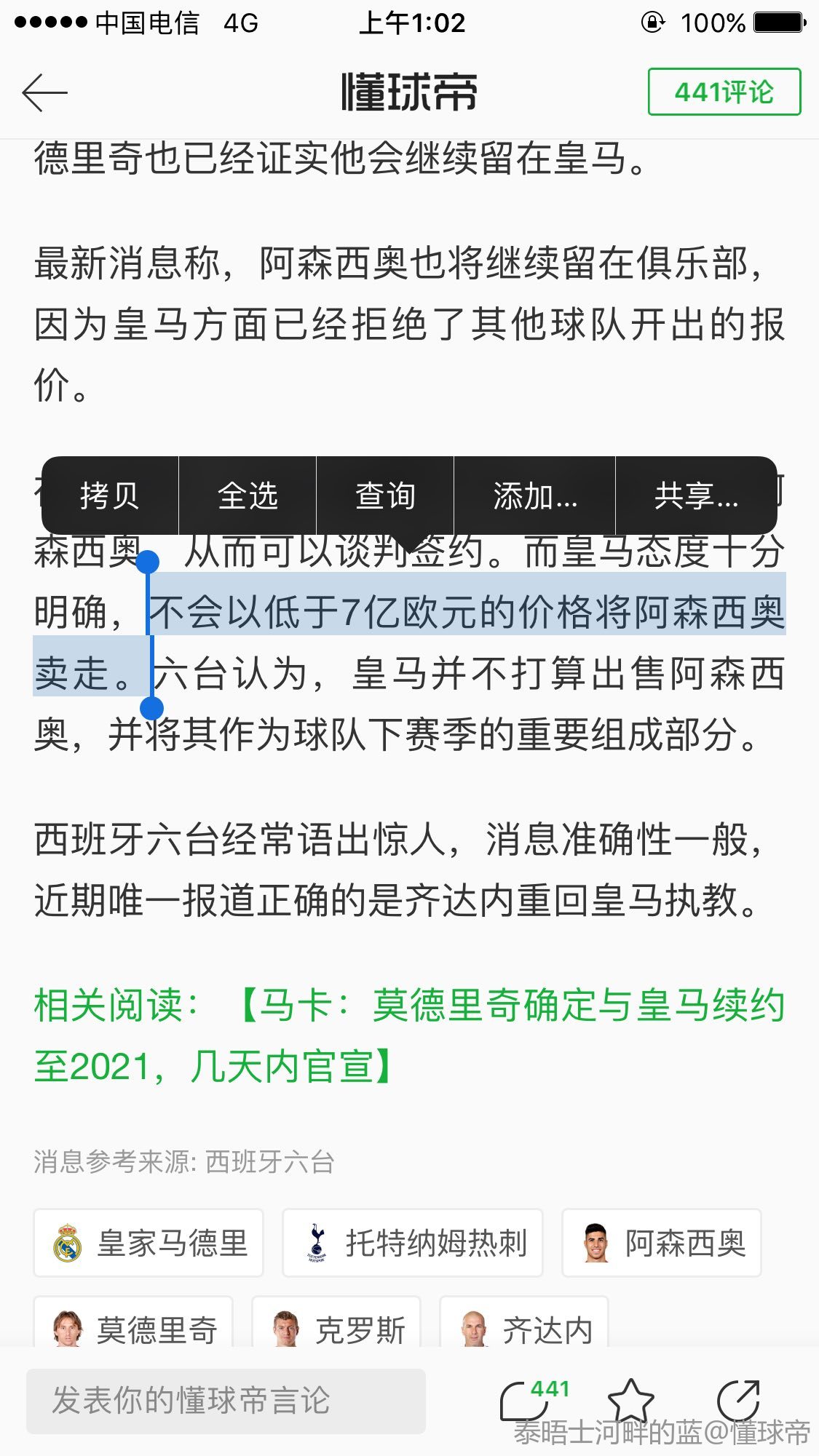 扫描下载懂球帝首页>动态> 西班牙六台:热刺求购阿森西奥,皇马称违约金达7亿欧元