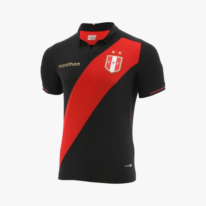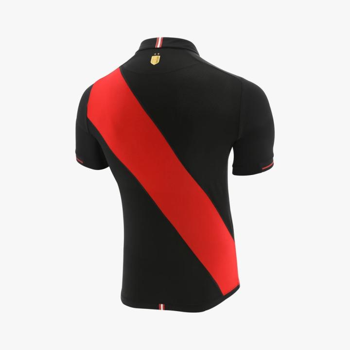 全新秘鲁国家队客场球衣采用与主场球衣相同的模板与设计细节,以黑色为基调的球衣搭配上经典红色绶带条纹,黑与红的碰撞让这件客场战袍看起来更具攻击性。