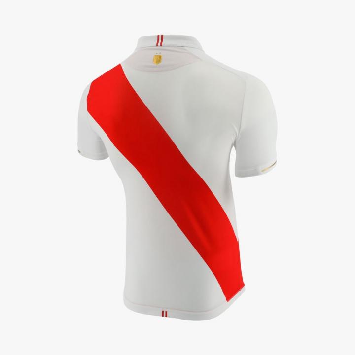 球衣胸前红色绶带内放置秘鲁足协徽章,徽章上的两颗金色五角星代表球队在1939年与1975年两次捧起美洲杯冠军奖杯的辉煌时刻。球衣衣领上加入象征秘鲁国旗的红白两色条带,背后衣领下方加入一枚金色秘鲁足协徽章,与衣袖上的金色条纹一起为这件新球衣增添尊贵气息。