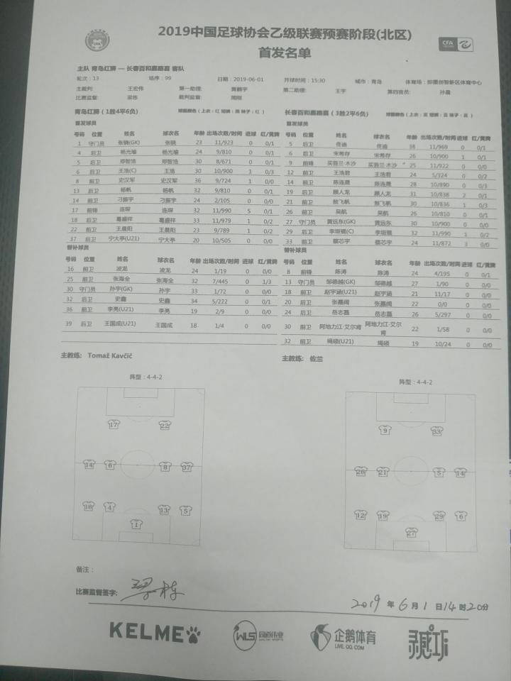 The match against Jilin Baijia is beginning soon. This is the teamsheet for this match.