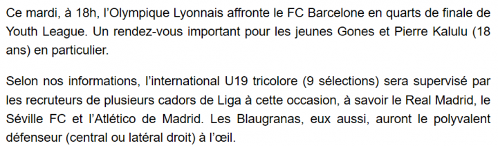 Foot Mercato:4月里昂对阵巴塞罗那的青年欧冠上,皇马,巴萨,马竞和塞维利亚的代表都关注了卡鲁鲁的发挥(图)