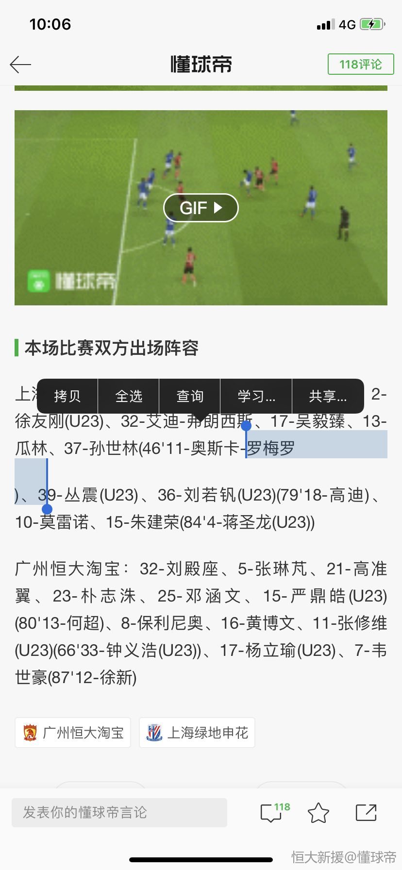 扫描下载懂球帝首页>动态> 青春风暴,申花恒大一战共10名U23出场