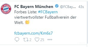 扫描下载懂球帝首页>动态> 获福布斯足坛最具价值俱乐部榜单第四,拜仁官方发推庆祝
