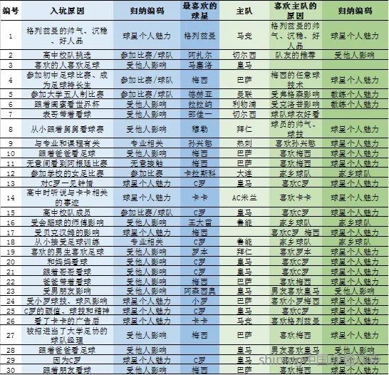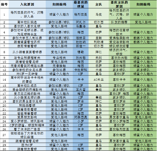 那么,足球推广人士如何吸引更多女性接触足球,俱乐部如何吸引女性球迷?本期打算通过分析懂球帝上的女球迷采访栏目的文本信息,来寻找一点思路。分析了7月及以前的30(满足调研最低样本数量要求)条女球迷采访信息文本,主要统计了“入坑原因(最开始接触或喜欢足球的原因)”、“最喜欢的球星”、“主队”、“喜欢主队的原因”,并对“入坑原因”和“喜欢主队的原因”这两个方面的数据进行了进一步归纳提炼。具体结果如表1所示。