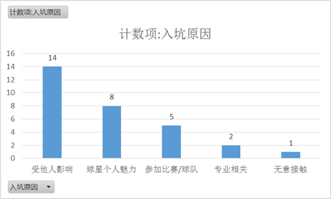 从表1中可以总结出一些规律性信息。首先看看入坑原因(见图1),乍一看,多种多样,但是经过进一步归纳,主要的原因只有三类:受他人影响(14/30)、球星个人魅力(8/30)、参加比赛/球队(3/30)。受他人影响主要是指跟着亲戚、朋友一起看球,也有个别是因为喜欢的人也喜欢足球而入坑;球星个人魅力主要就是因为球星的颜值、技术和品性三方面,而喜欢足球;参加比赛/球队,就是早年被莫名其妙拉去踢比赛,然后入坑。
