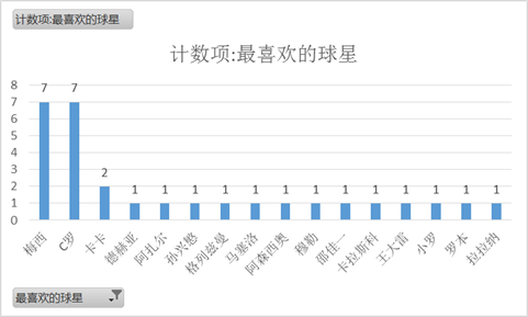 在最喜欢的球星方面(见图2),最受欢迎的还是绝代双骄,C罗(7/30)和梅西(7/30)。总体来看,大部分都是足坛巨星,各大球队主力。很奇快,这30个人中没有一个人提到内马尔…