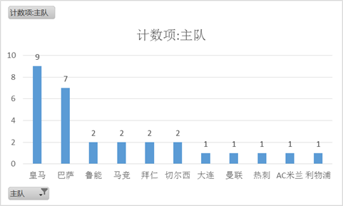 主队方面(见图3),皇马(9/30)和巴萨(7/30)还是遥遥领先。总体来看,大部分是欧洲强队,个别中超球队的出现则是由于球队是家乡球队。