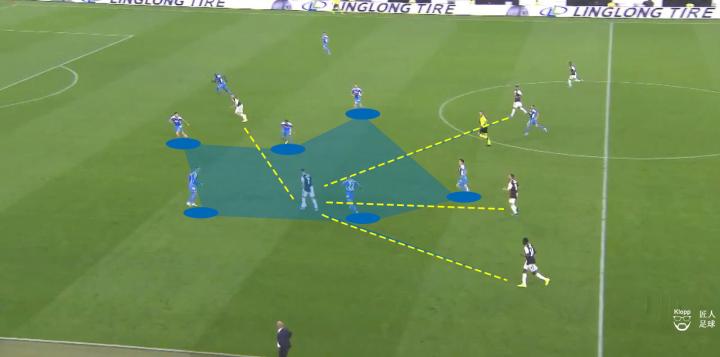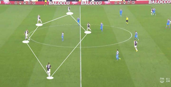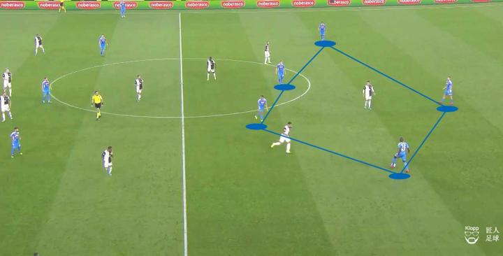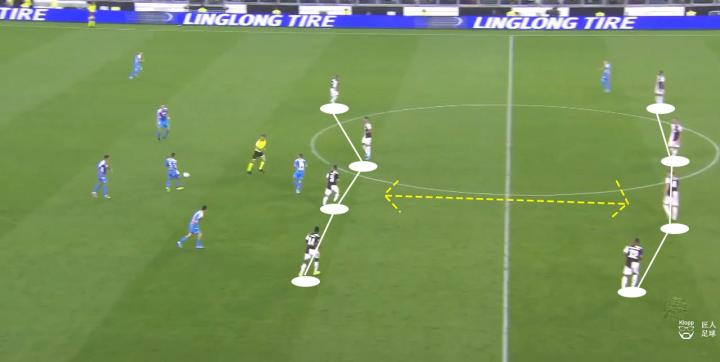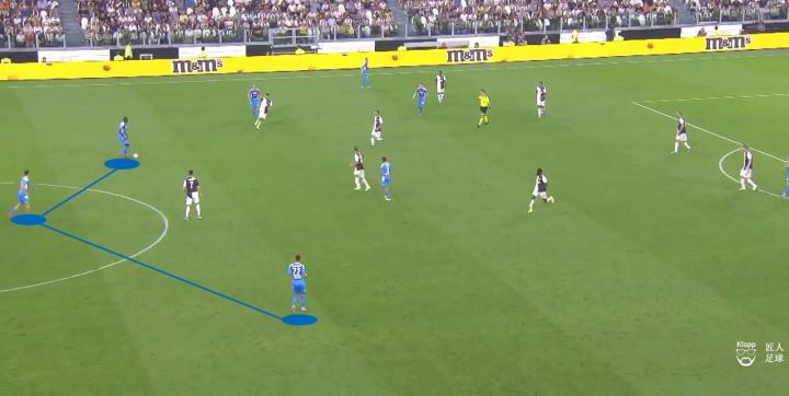 那不勒斯试图以两名防守中场在中圈附近的位置,增加后场组织时的互传点,以应对奔跑能力更强的尤文前场压迫。