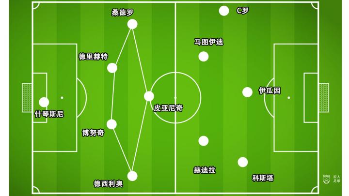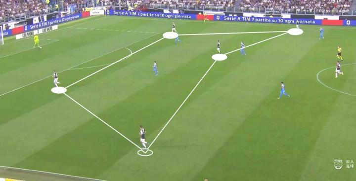 在尤文图斯的后场通过互传一步步将阵型往前推进的时候,另外两名中场球员马图伊迪与赫迪拉则在稍前的位置,与皮亚尼奇形成一个中场中路的三角组合。两人与皮亚尼奇保持着稳定的距离,作为全能中场的角色往返于进攻端与防守端,担任尤文图斯将皮球从后场输送到前场的连接点。