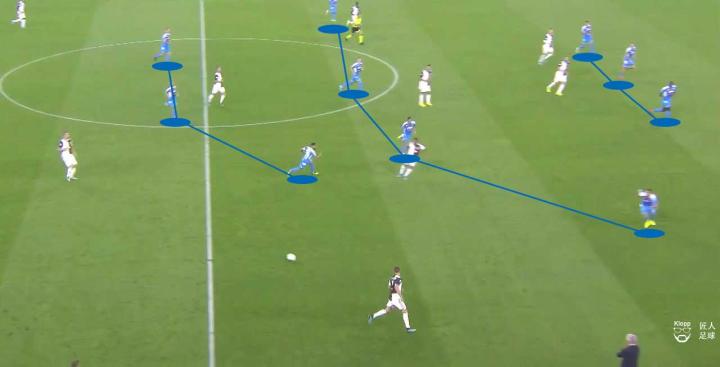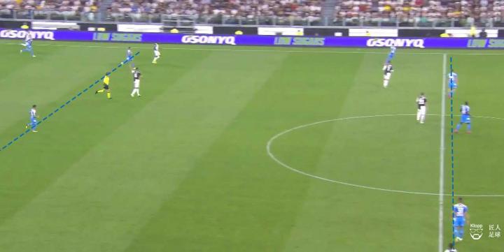 那不勒斯面对尤文的回传球,中前场两线试图采取前场压迫的同时,其与后场三中卫之间的距离拉开,球队的阵型被牵扯松散。尤文图斯得以通过快速传球渗透,打穿那不勒斯的高位防线。