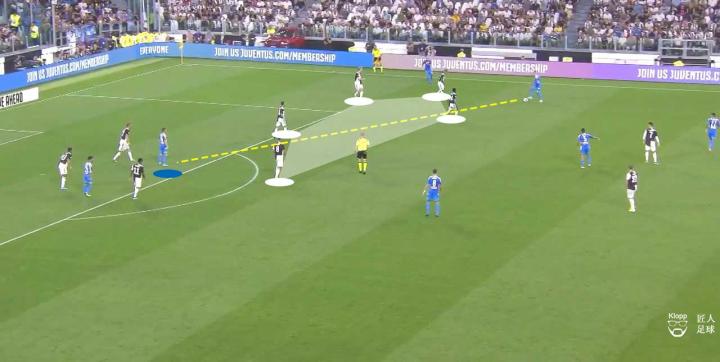 而当进攻边路难以寻求互传突破的时候,尤文图斯球员则会将皮球回传,重新将球权回到后场五人的互传运转,其目的是要吸引那不勒斯的中前场球员采取高位逼抢,将阵型往前压,以扩大其后场的空间。