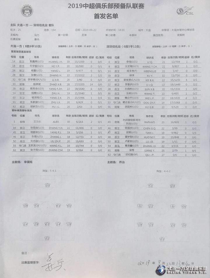 9月22日14:30,2019中超预备队联赛第25轮,大连一方预备队主场对阵深圳佳兆业预备队。经过90分钟的激战,大连一方预备队最终0-0战平深圳佳兆业预备队。