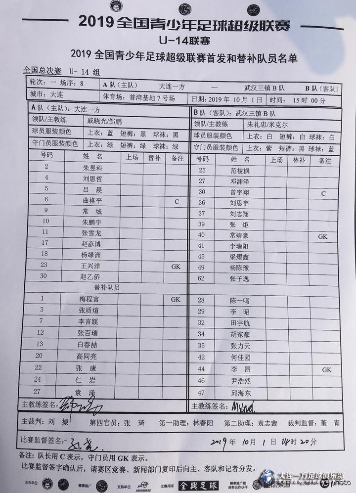 10月1日15:00,2019全国青少年足球超级联赛(U-14组)全国总决赛在大连青少年足球训练基地拉开战幕,大连一方首战武汉三镇B队。上半场曲格平助攻杨绿洲破门,下半场曲格平利用点球机会再入一球。最终大连一方2-0战胜武汉三镇B队取得小组赛开门红。