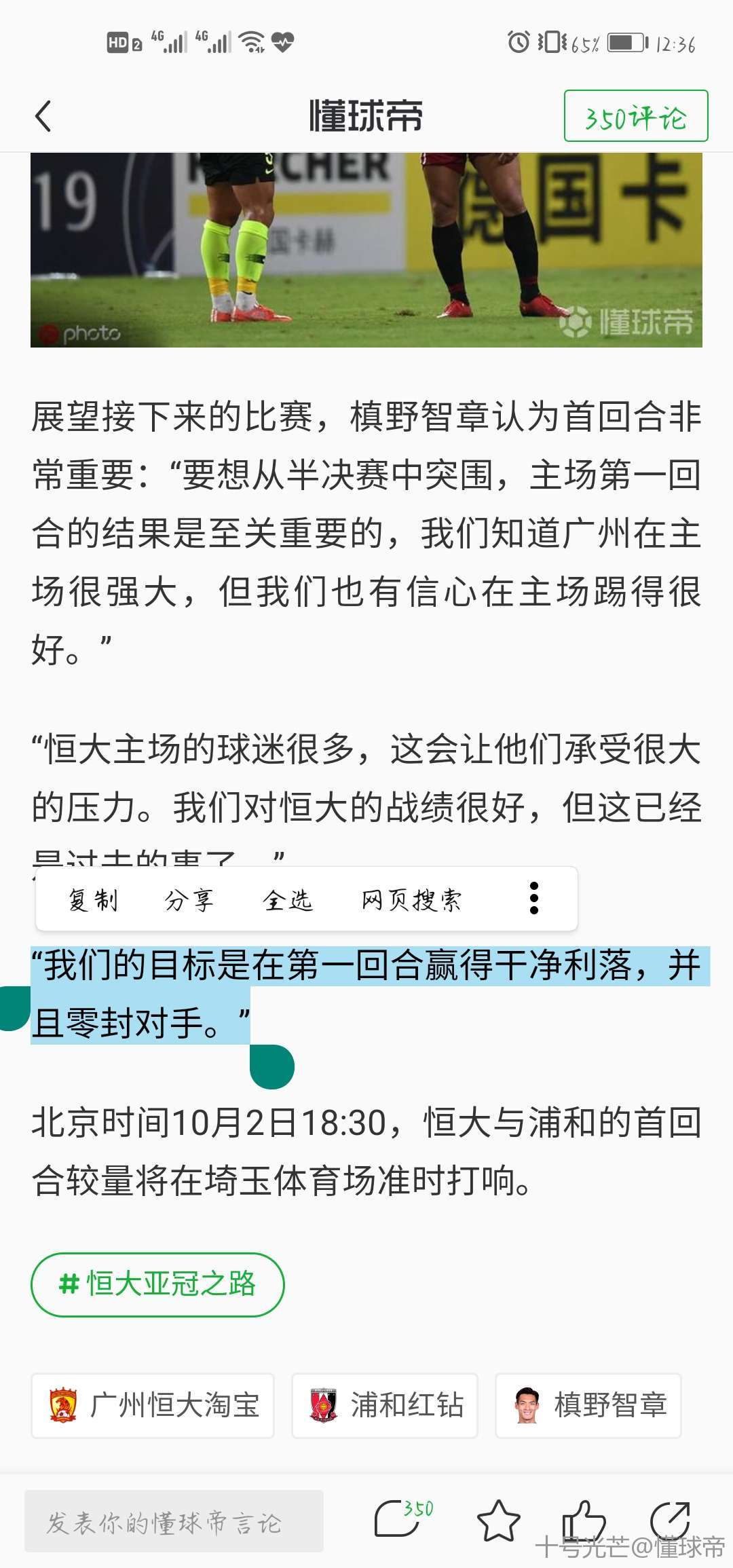 北京时间10月2日,亚冠半决赛首回合,广州恒大淘宝最终客场0-2不敌浦和红钻。浦和后卫槙野智章在赛后表示,球队一对一的防守成功限制了恒大的进攻并完成零封,而次回合到客场挑战对手仍要保持警惕。