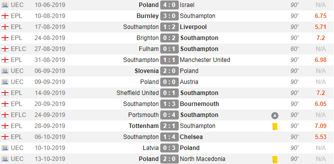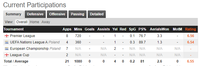 他还为波兰国家队出场4次,这四场比赛的平均分为6.54分。