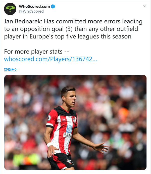 今天,Whoscored在Twitter发布了一项数据。南安普顿后卫贝德纳雷克本赛季失误导致的丢球数达3个,他也成为了五大联赛失误导致丢球数最多的球员。这三个进球依次发生于南安普顿主场对阵利物浦(菲尔米诺71分钟进球)、南安普顿主场对阵伯恩茅斯(卡鲁姆-威尔逊90+3分钟进球)和南安普顿主场对阵切尔西(芒特24分钟进球)的比赛。