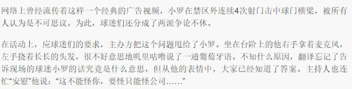 2. 按照小罗的说法,踢出这种4中横梁的脚法,是家常便饭。其实不用讨论这个视频是真是假,只要他能站出来,再表演一次,就是最好的论证,自己还能再火一回,可是他没有,反倒是之后的一个意思广告视频中,他再次尝试射门柱,这次只有2次命中。