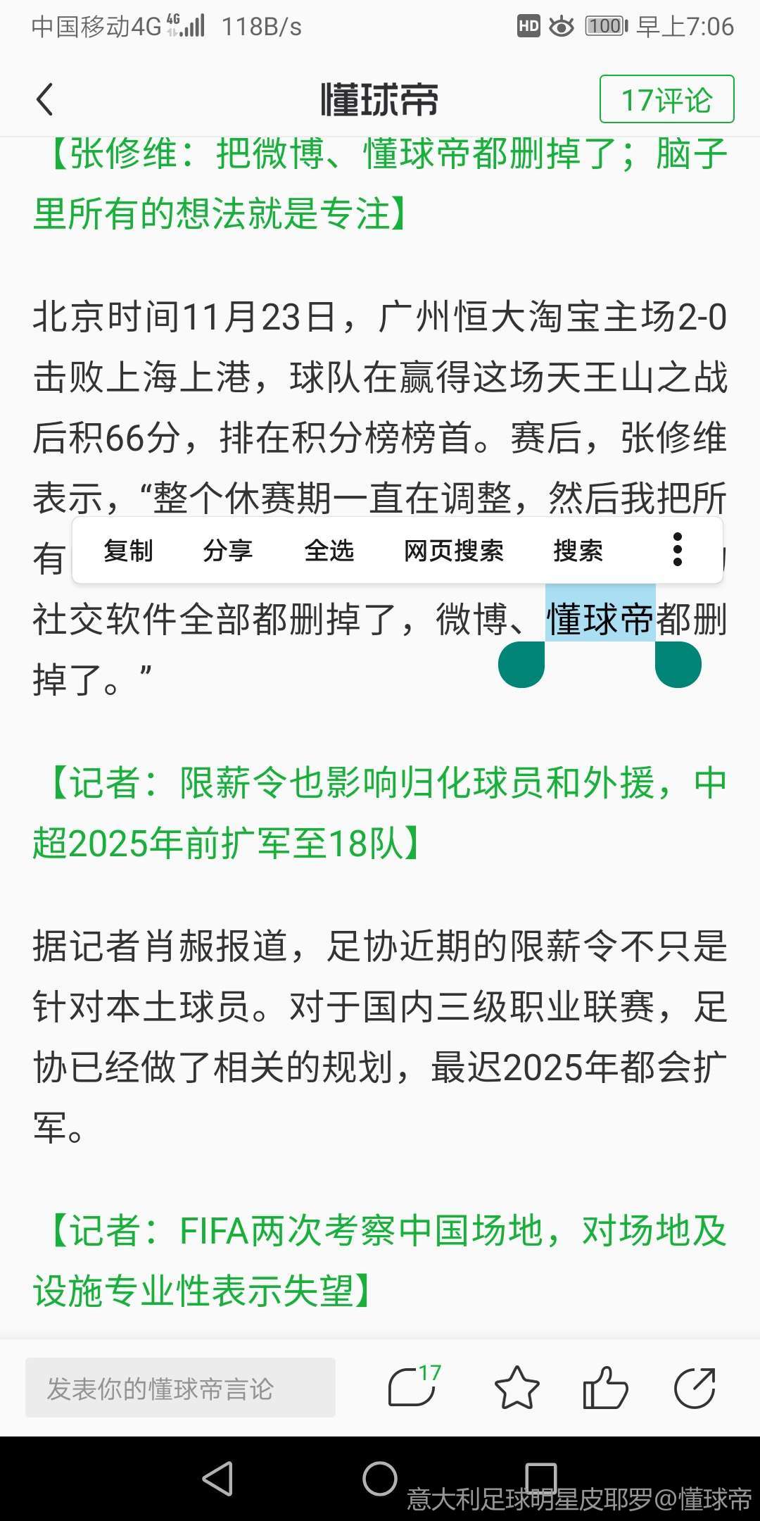 【张修维:把微博、懂球帝都删掉了;脑子里所有的想法就是专注】