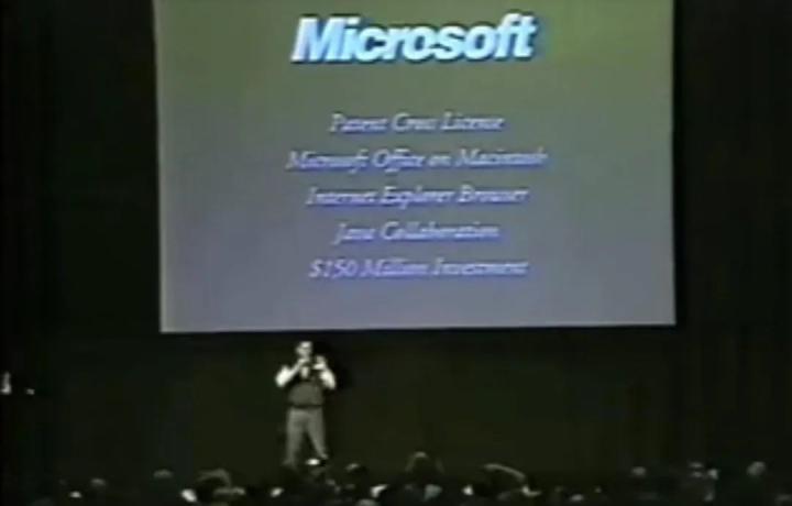 微软和苹果的关系真正迎来缓和,是乔布斯在 1997 年回归苹果之后。在当年的那场 Macworld 大会上,乔布斯上演了一场「英雄归来」的戏码,上场前的欢呼声不亚于娱乐明星,在 30 分钟的演讲中,乔布斯承认了过去几年苹果公司所犯的错误,同时宣布了一系列改革措施,其中一项就是要变得更开放。
