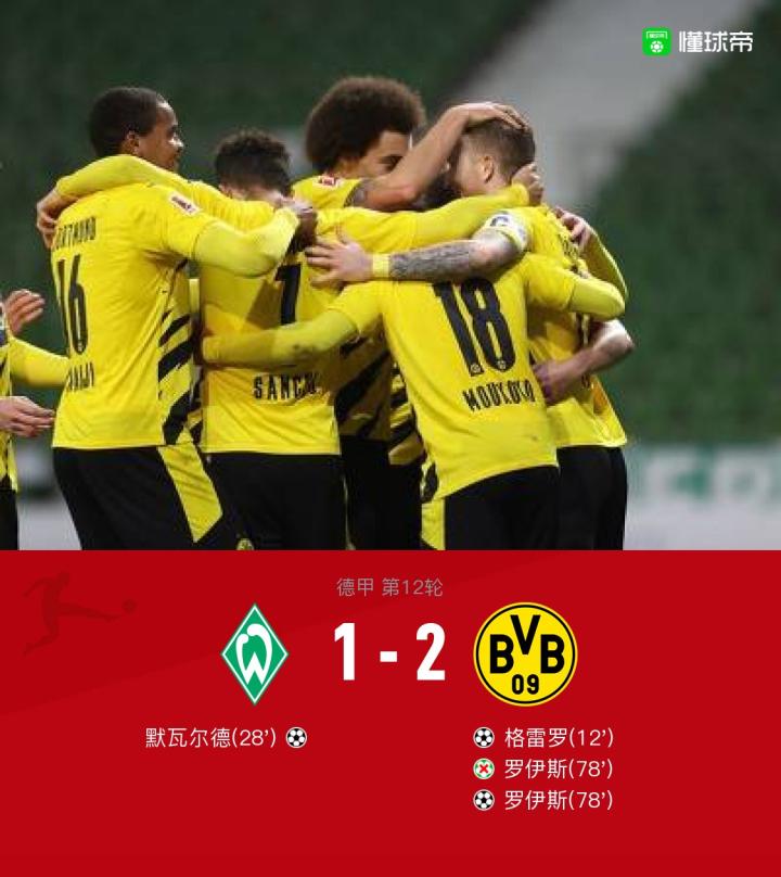北京时间12月16日3:30,德甲第12轮,多特蒙德客场对阵不莱梅,新帅泰尔齐奇迎来首场比赛。上半场,穆科科门前包抄铲射没能碰到皮球,格雷罗补射破门,默瓦尔德远射破门,格罗斯解围球击中立柱,阿坎吉门前垫射被扑。下半场,穆科科禁区内打门踢偏,格雷罗远射被门将抱住,罗伊斯主罚点球被扑出,随后补射破门,最终,多特客场2-1不莱梅,取得换帅后首场比赛的胜利。