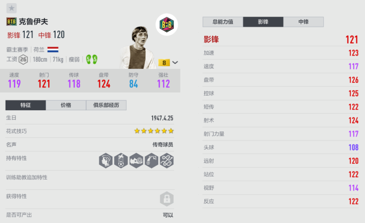 BTB赛季是克鲁伊夫目前最实用的赛季,比ICON和LN便宜、工资低,也比CAP表现更好些,综合指数最高。克圣的手感细腻,拿球做动作非常丝滑,在弧顶附近接球也能迅速调整,躲避掉后腰和后卫的冲抢。克鲁伊夫搓射很准,左右两侧都可以起脚打门,只要有空位就能制造威胁;BTB克鲁伊夫选位好,能时常出现在禁区内大力DD,得分效率比较高。BTB克鲁伊夫对抗稍有些软,需要多带球变向躲避冲撞。克鲁伊夫能打双前锋、前腰和边前卫,他比常规的十号位球员进攻倾向更高,在场上的存在感强,是一名很全面的技术流进攻球员。