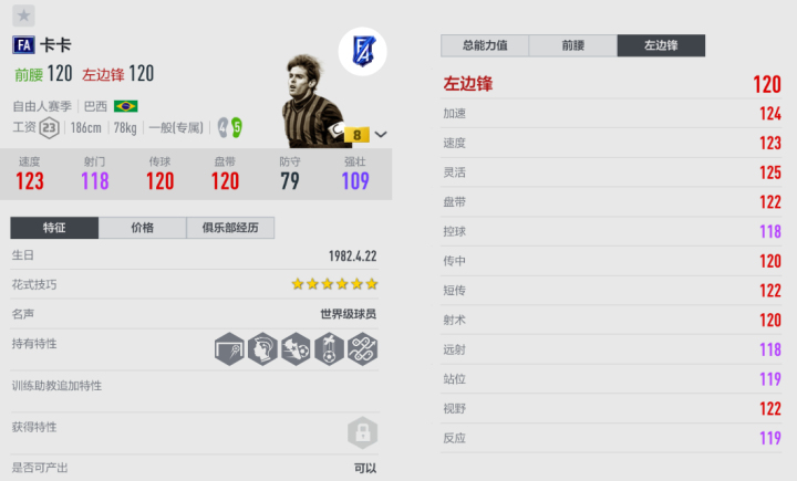 卡卡的赛季卡逐渐丰富,除了巅峰的ICON和LN赛季外,性价比最高的当属FA。和其他赛季相比,FA卡卡的独特性体现在,他在边路的传中质量最高。卡卡的速度快、前插积极,所以放在边路也能接直塞快速推进,下底后的选择多样,能直接起高球也可以急停倒三角渗透,他对防线的撕扯能力强。卡卡本身还有准确的远射和搓射,如果步点调整到位,用左脚也能打进ZD。卡卡的手感适中,拿球后可以左右扭身子摆脱,他对球的控制比较好,但是正面做花式的流畅性不如小快灵。不管是打前腰还打边锋,卡卡都可以安装“煲汤”助教,接到直塞后趟一下,可以更快地甩开防守球员。对于微氪党来说,FA卡卡是张性价比高、位置多样的全能攻击手,喜欢卡卡的朋友推荐使用。