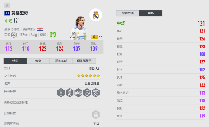 “金球先生”莫德里奇技术出众、头脑清晰,是皇马数次登顶欧冠的核心中场。莫德里奇在近年来才改穿10号球衣,此前在皇马他身披19号战袍,这个看似不起眼的数字,被莫德里奇赋予了“魔法”。由于模型的限制,莫德里奇比较适合出任前腰和中前卫,偶尔缺人时再客串后腰更合适。21U莫德里奇体型轻盈、盘带手感丝滑,拿球后可以随意做大幅度的动作,硬直很小,具备了在中路拿球推进的能力。莫德里奇有一脚硬实的远射,能抽出球速极快的射门,并且搓射的弧线也很明显,这都有利于他在前场破门。21U莫德里奇直塞精准,ZW还时常能触发外脚背传球,助攻能力强;魔笛的防守意识还不错,在中圈附近能提供一些拦截效果。21U和BTB赛季比较接近,前者的性价比高一些且工资低,而后者的射门更精准些,各有所长。