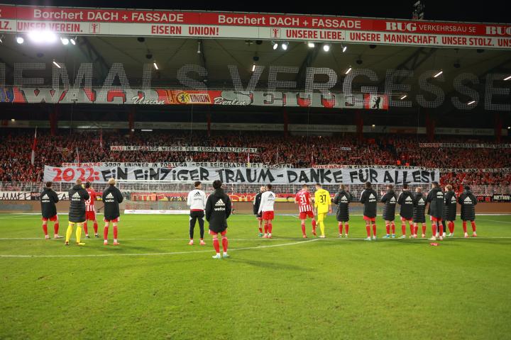 在昨日对阵奥格斯堡的比赛中,柏林联球迷们打出了横幅以纪念2022年球队优异的表现,并以这种形式向柏林联合工作人员与球员们表达了感谢。