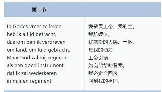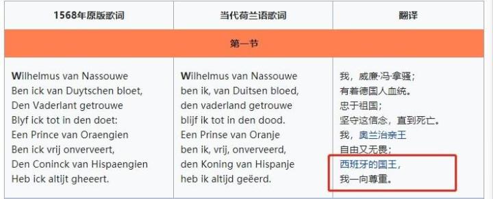 荷兰国歌一共15节,一般的场合只唱第一节。“忠于西班牙国王”的歌词就出现在第一节的最后一句里。