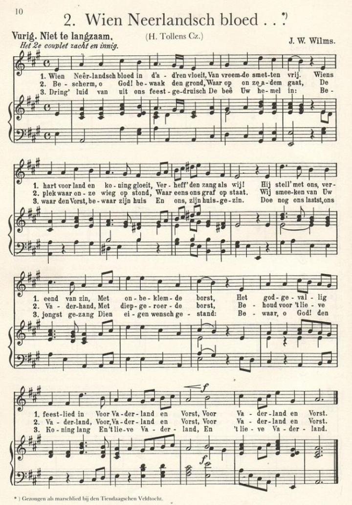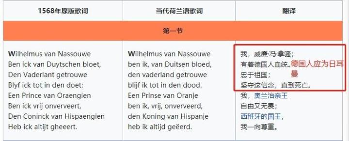 荷兰比赛只唱的第一节当歌词开头:“我,威廉-范(冯)-拿骚,身上流着日耳曼的血液。”表明了威廉以及他所在的尼德兰地区是神圣罗马帝国,身上的文化是日耳曼文化。也可以认为是日耳曼人和西班牙人划清界限。