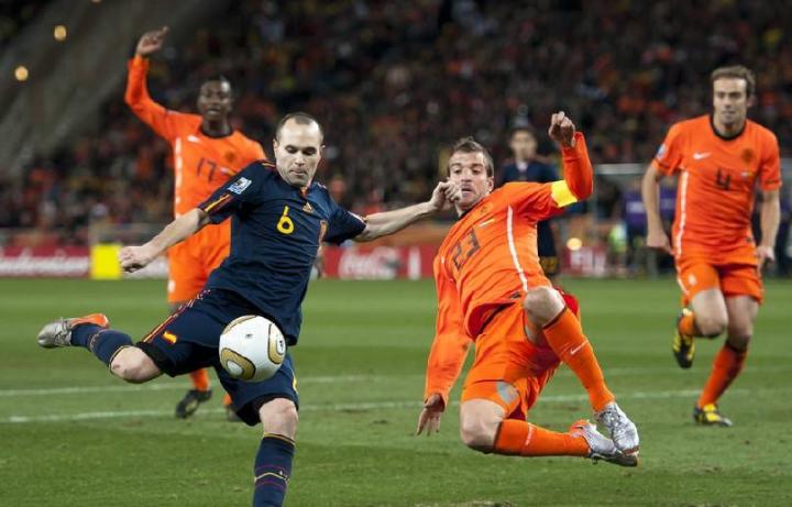 2010年世界杯,荷兰对阵西班牙的比赛。加时赛,伊涅斯塔的进球,荷兰0-1不敌西班牙,再次屈居亚军。