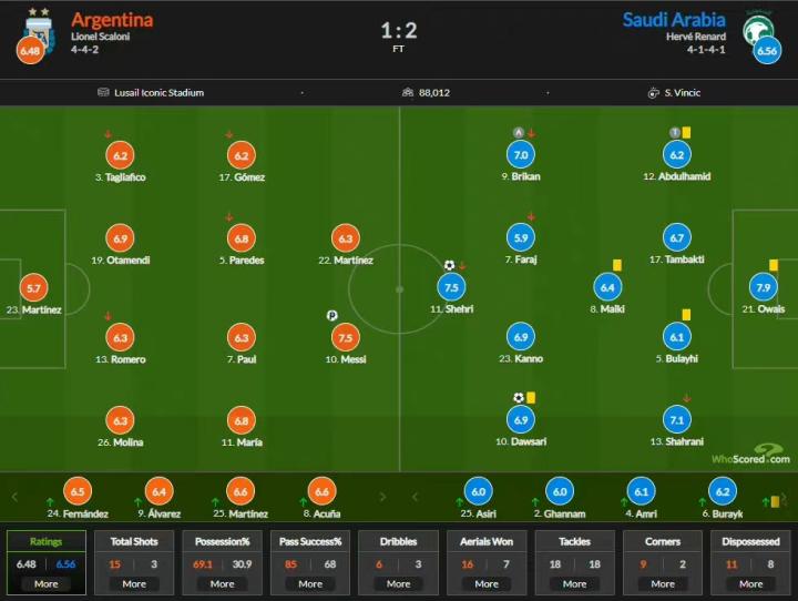 阿根廷的上半场踢得相当糟糕,迪马利亚在右路几乎没有发挥,莫利纳、塔利亚菲科、德保罗在防守中都有失误,更重要的是阿根廷失去的中场的控制是非常明显的,虽然阿根廷打入了3个越位球和沙特的战术成功有关,但越位其实和阿根廷跑位不积极有关系更大!无论怎样,斯卡洛尼应该在半场就做出调整,尤其是在比分领先的情况下——换下戈麦斯,换上小恩佐,加强中场的控制。