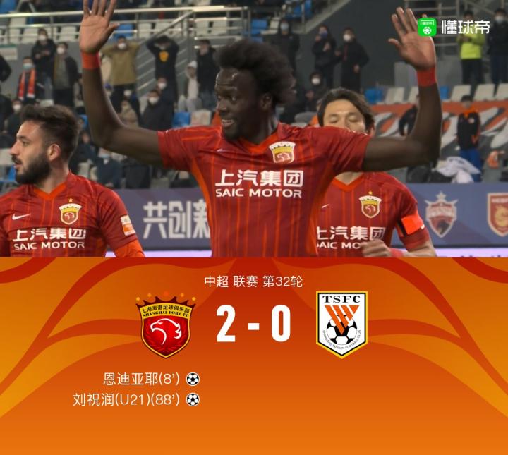 北京时间12月23日晚间20:00,中超联赛第32轮,上海海港对阵山东泰山,本场比赛在晋江足球训练中心体育场进行,主裁判为张雷,VAR视频助理裁判为邢琦。上半场,恩迪亚耶头球为上海海港首开纪录,陈蒲错失空门良机,恩迪亚耶失单刀,贾德松伤退。下半场,陈蒲破门被吹,恩迪亚耶再失单刀,费莱尼替补登场肩部受伤后被换下,刘祝润替补破门终结比赛。最终,上海海港2-0山东泰山。