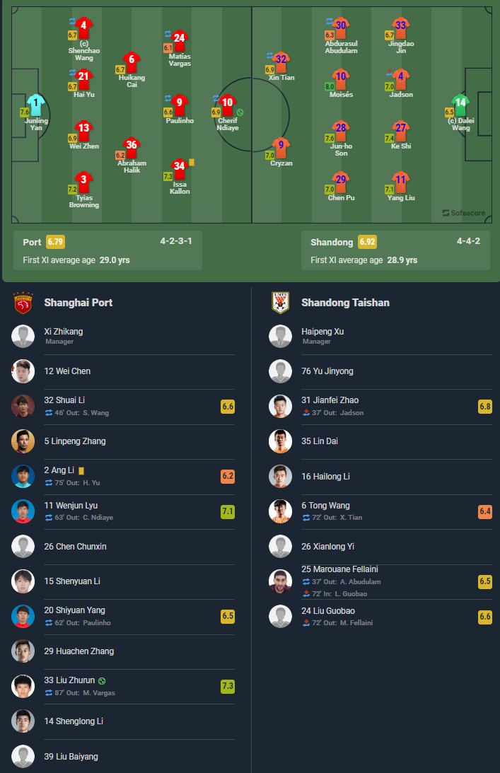 上海海港首发:1-颜骏凌、21-于海(74'2-李昂)、3-蒋光太、13-魏震、4-王燊超(46'32-李帅)、36-阿布拉汗-哈力克(U23)、6-蔡慧康、34-伊萨-卡隆、9-保利尼奥(62'20-杨世元)、24-巴尔加斯(86'33-刘祝润(U23))、10-恩迪亚耶(62'11-吕文君)