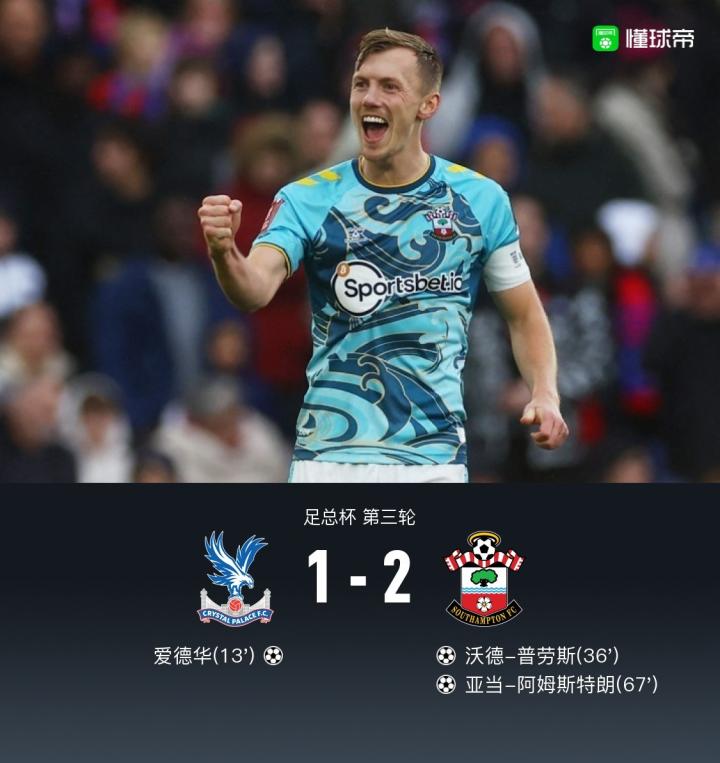 扫描下载懂球帝首页>动态> 南安普顿2-1水晶宫晋级,瓜伊塔低级失误送大礼,普劳斯破门