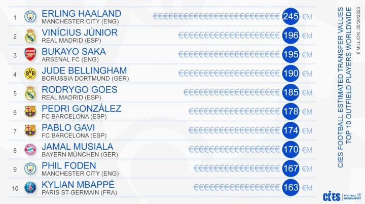 扫描下载懂球帝首页>动态> 懂球号> 瑞士CIES统计足坛身价榜单:哈兰德居首,维尼修...