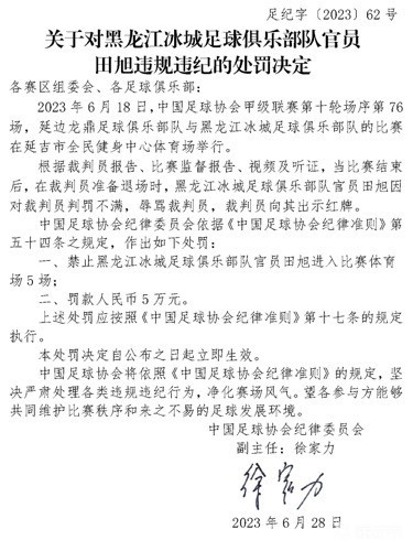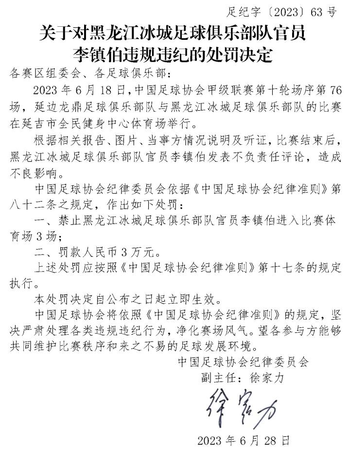 6月28日,中国足协官方宣布,对黑龙江冰城投资人李镇伯、门将教练田旭进行纪律处罚。