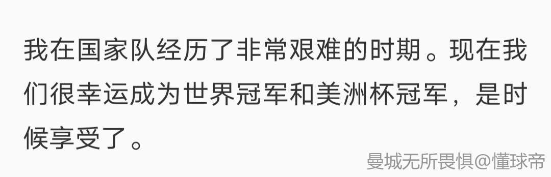 我在国家队经历了非常艰难的时期。现在我们很幸运成为世界冠军和美洲杯冠军,是时候享受了。