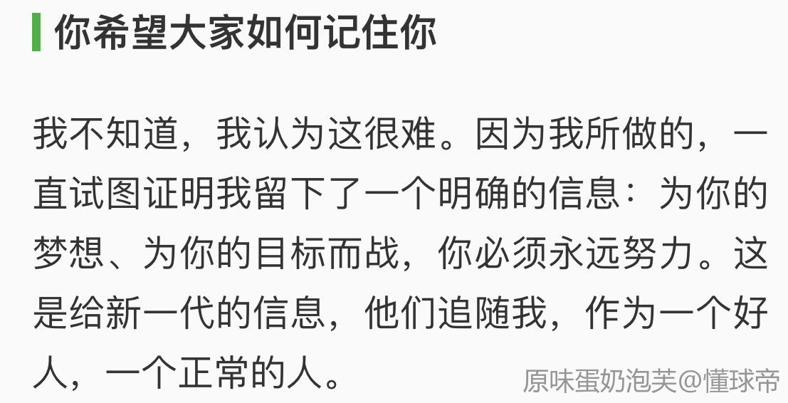 我不知道,我认为这很难。因为我所做的,一直试图证明我留下了一个明确的信息:为你的梦想、为你的目标而战,你必须永远努力。这是给新一代的信息,他们追随我,作为一个好人,一个正常的人。