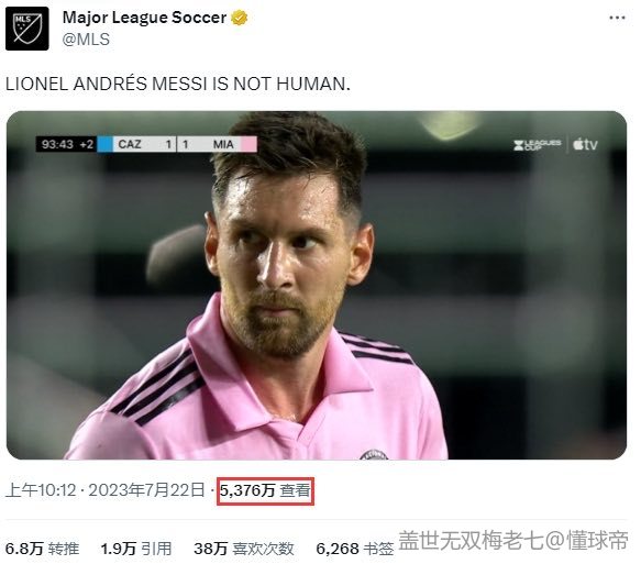 美职联官推梅西任意球绝杀视频浏览量超过了5300万。
