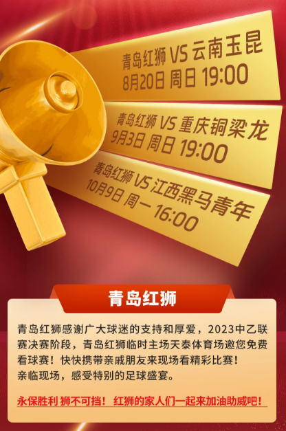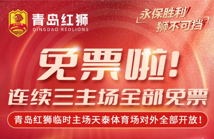 懂球帝首页>动态> 懂球号> 中乙联赛冲甲组阶段,青岛红狮前三个主场全部免票啦!