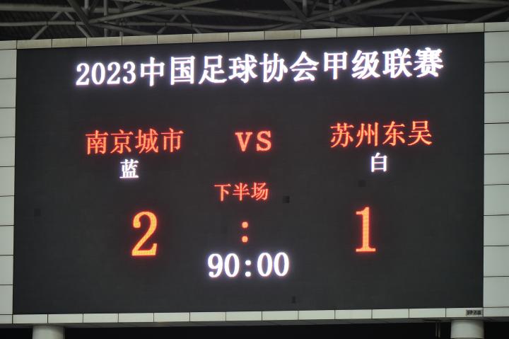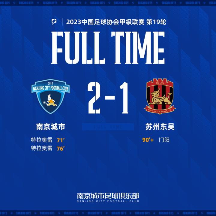 上半场比赛,双方整体表现势均力敌,但是,梅西在第17分钟和上半场伤停补时阶段连续因为犯规被裁判出示了两张黄牌,被罚离出场。在10打11的不利局面下,下半场,南京城市队及时调整战术。在顶住了对手一波波攻势后,第71分钟,阿巴别克热传球,特拉奥雷底线得球强行突破,连续晃动后一脚抽射破门,为南京城市队打破僵局!!!第76分钟,黄子豪后场直接长传发动进攻,特拉奥雷抢在对方门将出击之前将球捅进球门,南京城市队再下一城!下半场补时阶段,苏州东吴扳回一城。最终,少打一人的南京城市在主场2-1击败苏州东吴,全取三分!!!