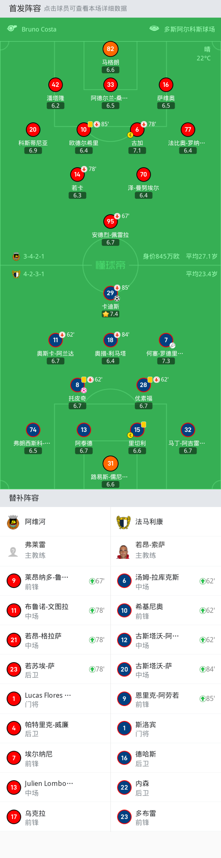 上场替补:78'23-若苏埃-萨, 78'21-若昂-格拉萨, 67'9-莱昂纳多-鲁伊斯, 78'11-布鲁诺-文图拉