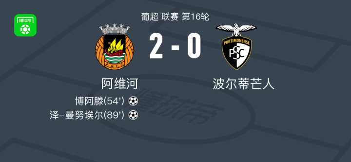 北京时间1月8日葡超 联赛 第16轮,阿维河主场对阵波尔蒂芒人。阿维河博阿滕破门,泽-曼努埃尔破门。波尔蒂芒人。最终比分2-0。