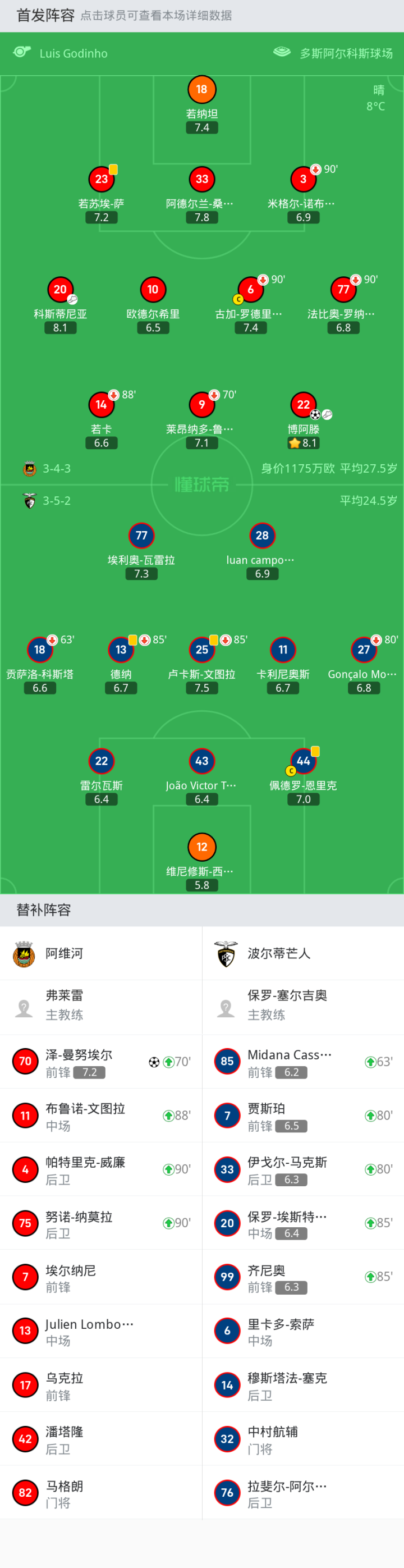 上场替补:85'20-保罗-埃斯特雷拉, 80'33-伊戈尔-马克斯, 80'7-贾斯珀, 85'99-齐尼奥, 63'85-Midana Cassama