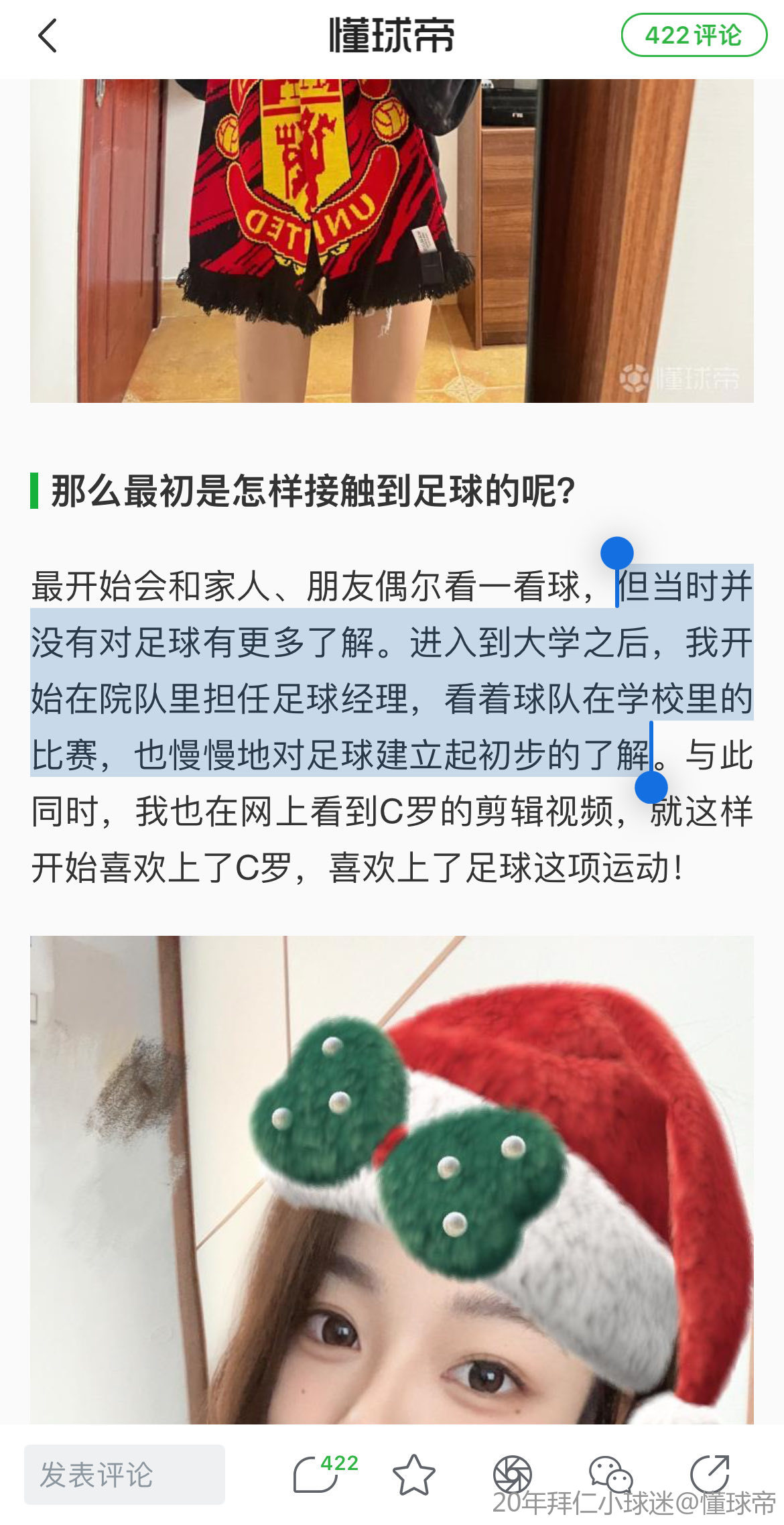 最开始会和家人、朋友偶尔看一看球,但当时并没有对足球有更多了解。进入到大学之后,我开始在院队里担任足球经理,看着球队在学校里的比赛,也慢慢地对足球建立起初步的了解。与此同时,我也在网上看到C罗的剪辑视频,就这样开始喜欢上了C罗,喜欢上了足球这项运动!