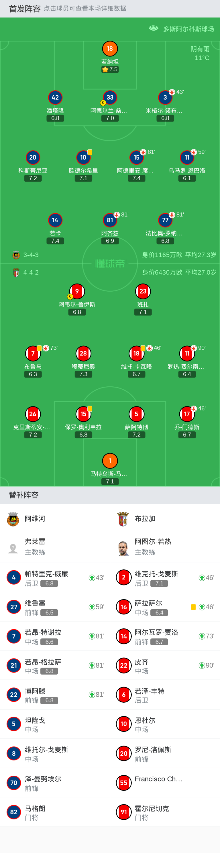 上场替补:81'7-若昂-特谢拉, 81'21-若昂-格拉萨, 81'22-博阿滕, 59'27-维鲁塞, 43'4-帕特里克-威廉