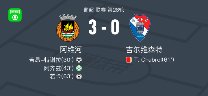 在葡超联赛第28轮的比赛中,阿维河队主场迎战吉尔维森特队。若昂-特谢拉、若卡和阿齐兹分别攻入一球,最终比分为3-0,阿维河队取得胜利。