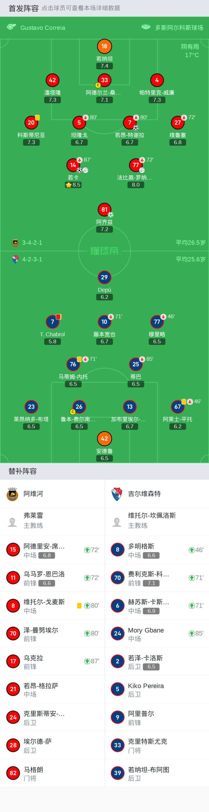 阿维河首发:33-阿德尔兰-桑托斯, 7-若昂-特谢拉, 18-若纳坦, 14-若卡, 27-维鲁塞, 42-潘塔隆, 4-帕特里克-威廉, 81-阿齐兹, 20-科斯蒂尼亚, 5-坦隆戈, 77-法比奥-罗纳尔多